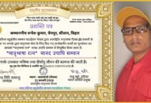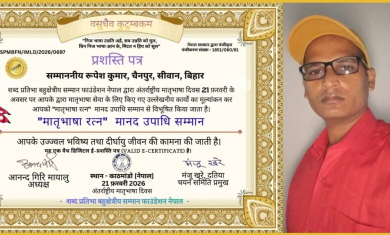 रूपेश कुमार की प्रतिभा की धूम विदेशों तक , अंतरराष्ट्रीय मातृभाषा दिवस पर नेपाल की संस्था शब्द के द्वारा मातृभाषा रत्न मानद उपाधि से सम्मानित किया गया ।