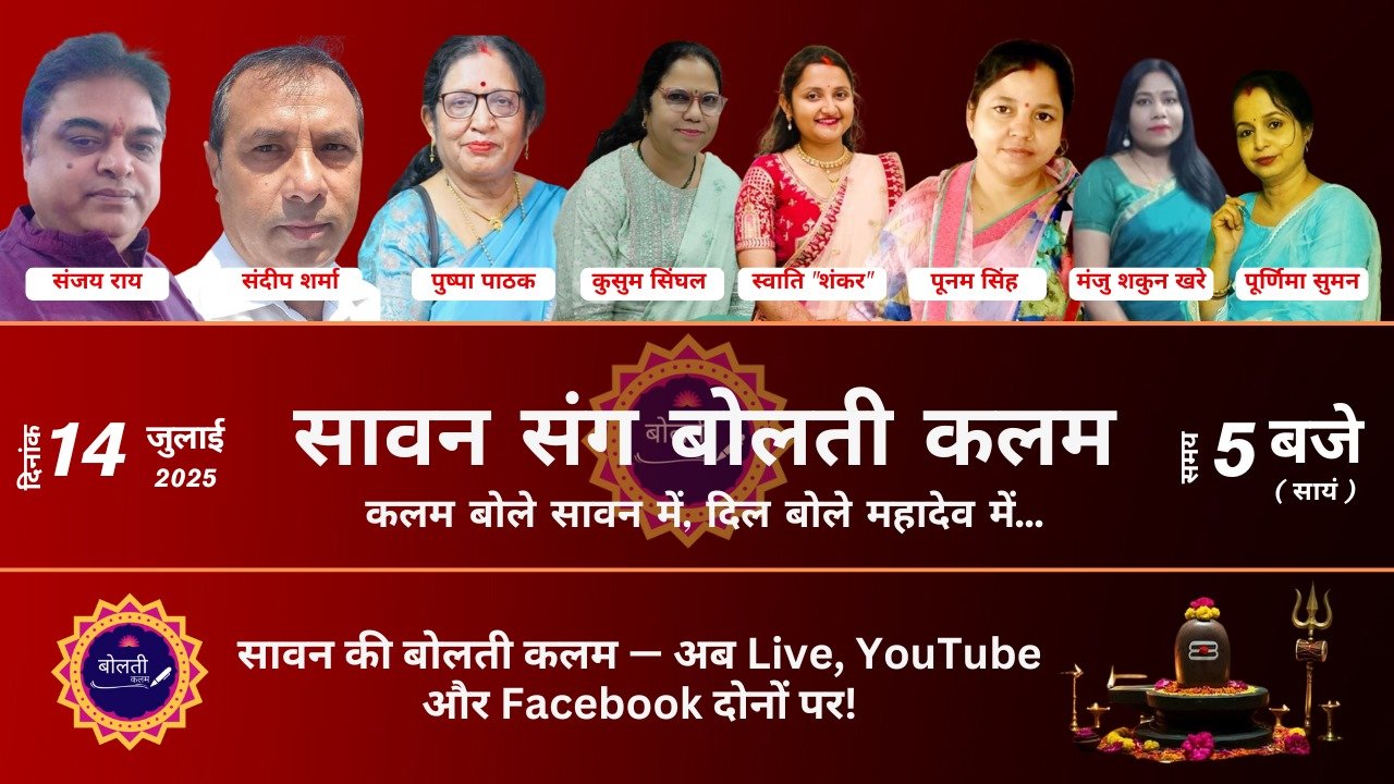 सावन के पवित्र महीनें मे बोलती कलम मंच के द्वारा बाबा भोलेनाथ को समर्पित काव्य संध्या का आयोजन किया गया जिससे साहित्य के प्रति अपने मुल्यों व सनातन संस्कृति को जीवंत रखने के अनूठे प्रयास मे बोलती कलम ने फिर से अपनी प्रतिबद्धता साबित की।।