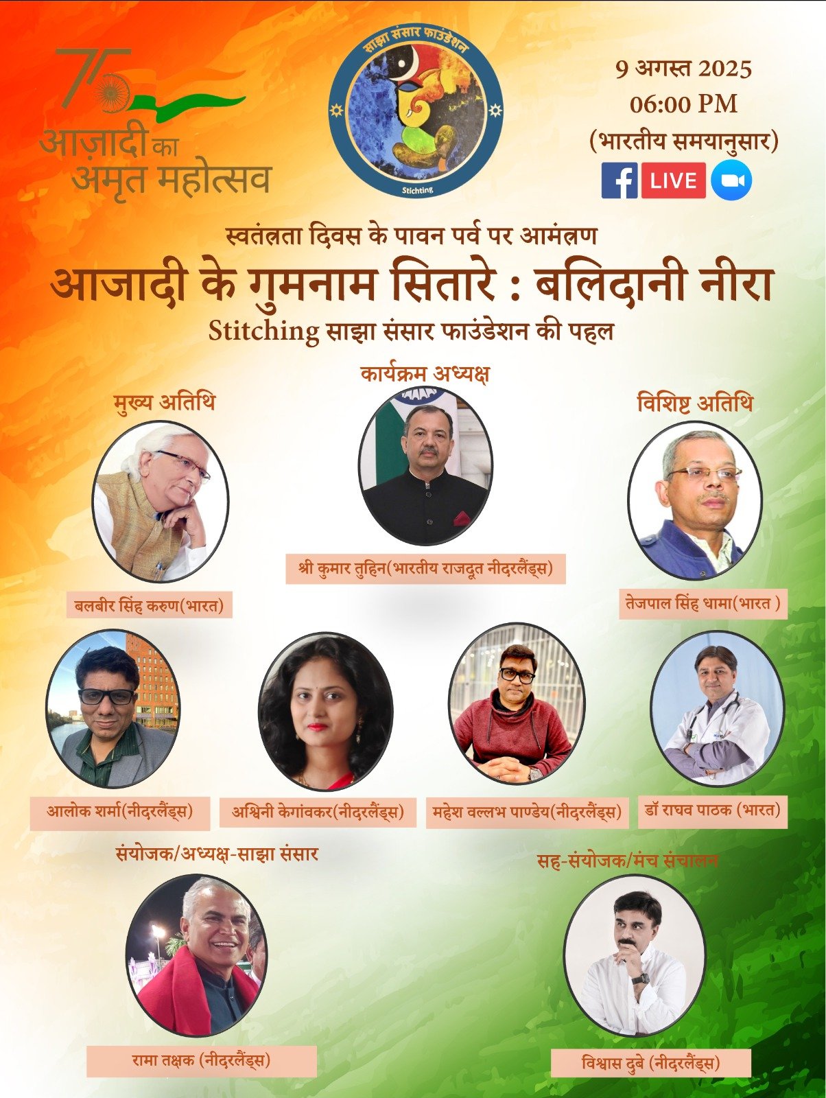 साझा संसार फाऊंडेशन की पहल पर, भारतीय स्वतंत्रता दिवस के उपलक्ष में, ‘आजादी के गुमनाम सितारे : नीरा बलिदानी’ विषय पर ऑनलाइन आयोजन, नीदरलैंड्स में भारतीय राजदूत महामहिम श्री कुमार तुहिन की अध्यक्षता में सम्पन्न हुआ। लोकप्रिय कवि श्री बलबीर सिंह ‘करुण’ मुख्य अतिथि और ‘नीरा आर्य’ फिल्म के निर्माता श्री तेजपाल धामा विशिष्ट अतिथि थे।