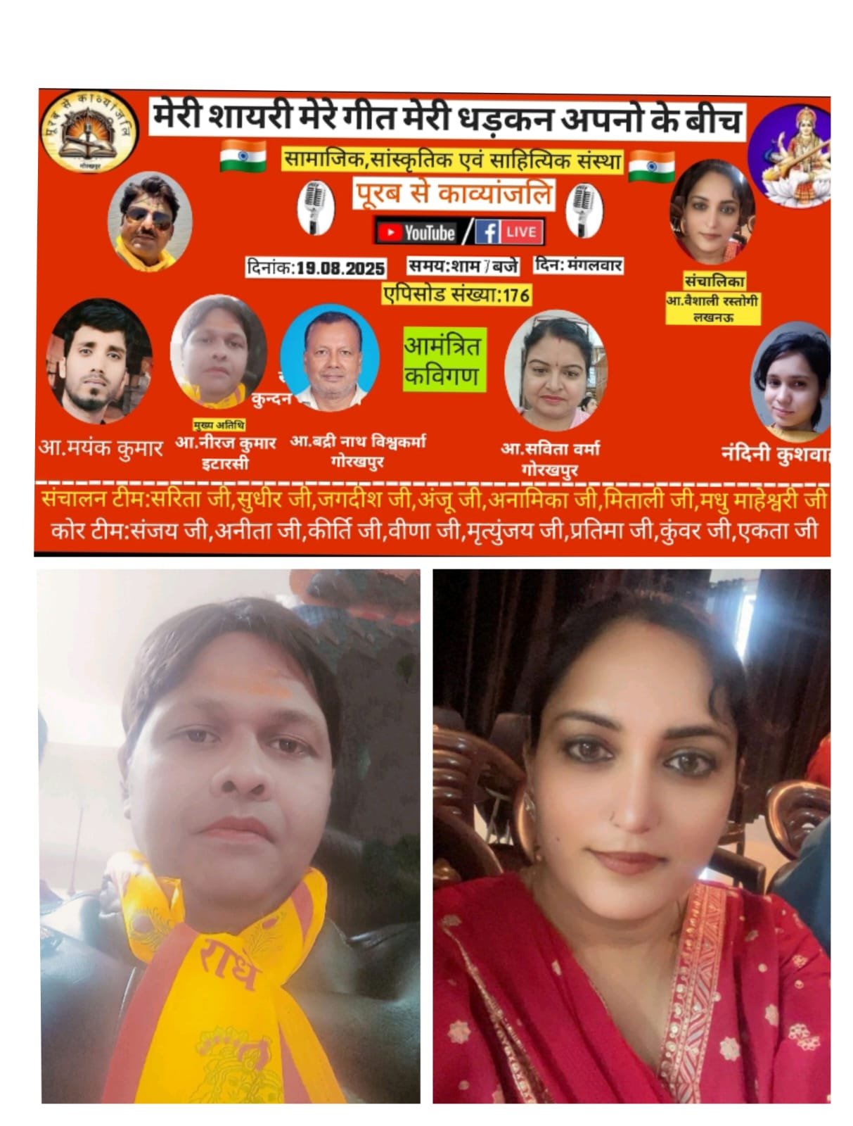 मेरी शायरी मेरे गीत मेरी धड़कन अपनों के बीच लाइव कार्यक्रम सामाजिक सांस्कृतिक एवं साहित्य संस्था पूरब से काव्यांजलि के श्री कुंदन वर्मा जी द्वारा 19.08.25
