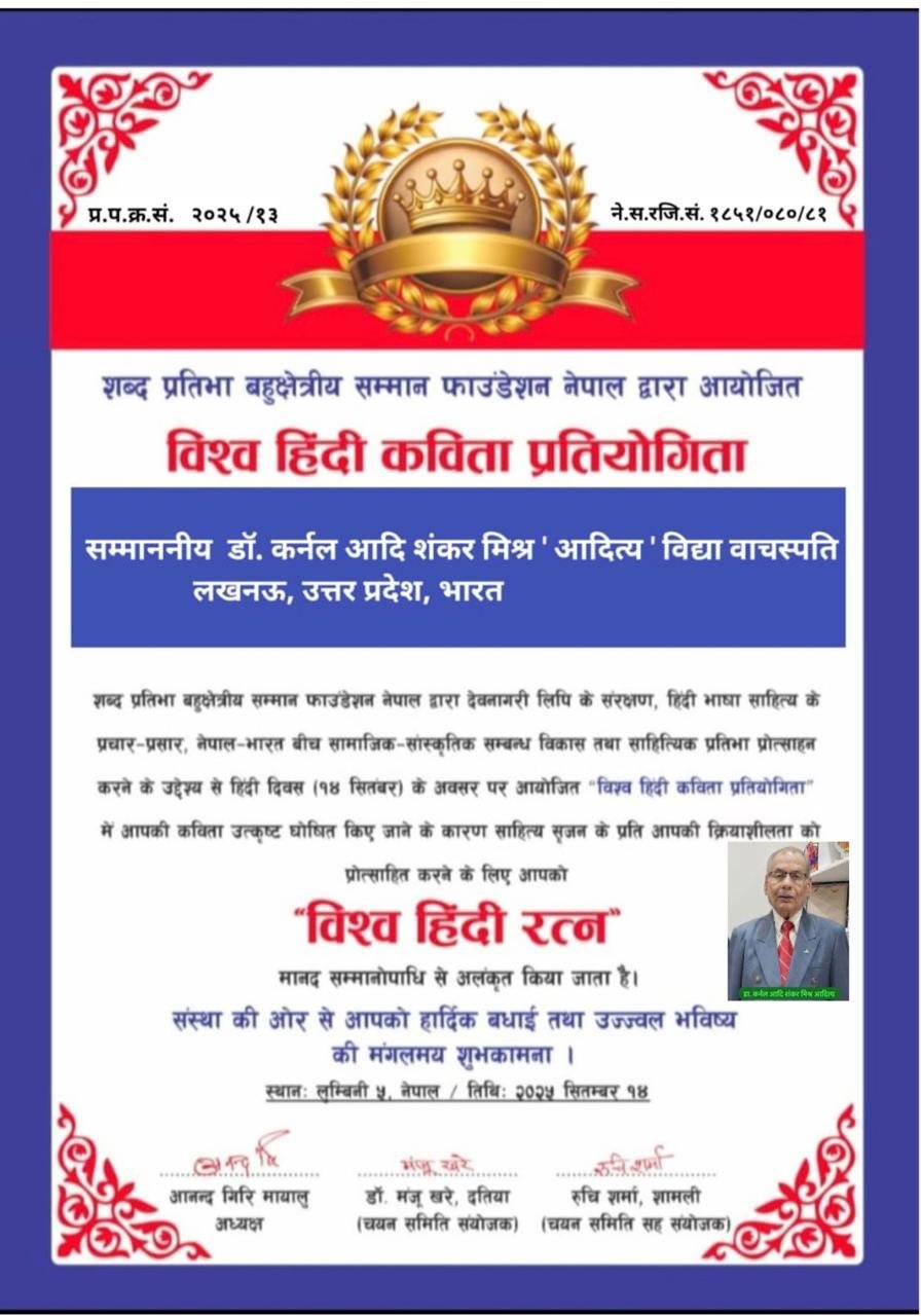 को विश्व हिंदी दिवस पर सम्मानित किया गया है। नेपाल की प्रसिद्ध संस्था “शब्द प्रतिभा बहुक्षेत्रीय सम्मान फाउन्डेशन” नेपाल द्वारा हिंदी दिवस के संदर्भ में आयोजित विश्व हिंदी कविता प्रतियोगिता में उत्कृष्ट कविता रचना के आधार पर डॉ कर्नल मिश्र को विश्व हिंदी रत्न मानद उपाधि सम्मान से प्रशस्ति पत्र व सर्टिफिकेट प्रदान कर सम्मानित किया गया है। ज्ञात हो कि लखनऊ निवासी 77 वर्षीय डॉ कर्नल मिश्र भारतीय सेना से सेवानिवृत हैं। इनकी सात काव्य संग्रह और दो लेख संग्रह प्रकाशित हो चुके हैं। साथ ही हज़ारों रचनायें देश विदेश की विभिन्न पत्र पत्रिकाओं में प्रकाशित हो चुकी है और होती रहती हैं तथा साहित्य के क्षेत्र में उल्लेखनीय योगदान के लिए लगभग चार सौ प्रतिष्ठित सम्मान पत्र, प्रशस्ति पत्र और प्रमाण पत्र भी मिल चुके हैं। ज्ञात हो कि डॉ कर्नल आदि शंकर मिश्र ‘आदित्य’ को पहले ही हिन्दी साहित्य में डॉक्टरेट की मानद उपाधि, डॉक्टर ऑफ़ सोशल वर्क, डॉक्टर ऑफ़ डिविनिटी तथा काशी हिन्दी विद्यापीठ से विद्या वाचस्पति की मानद उपाधियाँ प्राप्त हो चुकी हैं साथ ही काशी विद्यापीठ से साहित्य शिरोमणि, स्मृति मानद सम्मान और प्रेरणा हिंदी प्रचारिणी सभा से ‘हिन्दी सेवी सम्मान’ और ‘हिंदी रत्न सम्मान’ मिल चुके हैं।