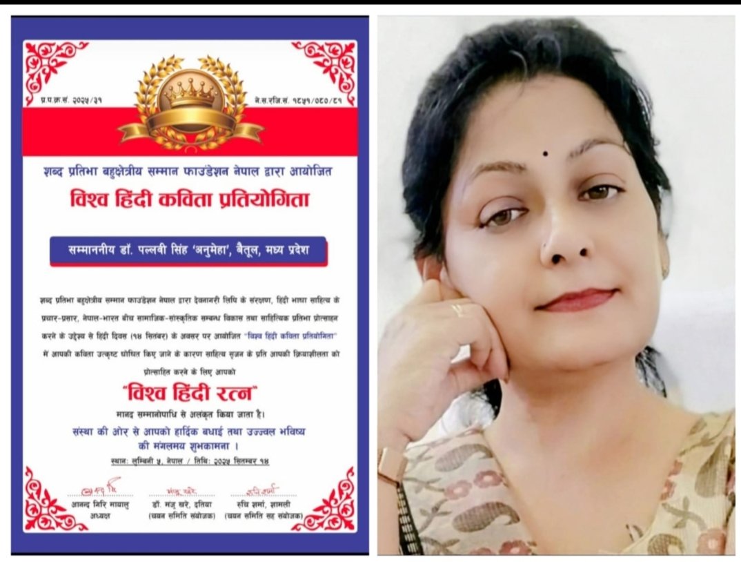 हिंदी दिवस पर मिला विश्व हिंदी रत्न मानद उपाधि से सम्मानित- डॉ. पल्लवी सिंह ‘अनुमेहा’