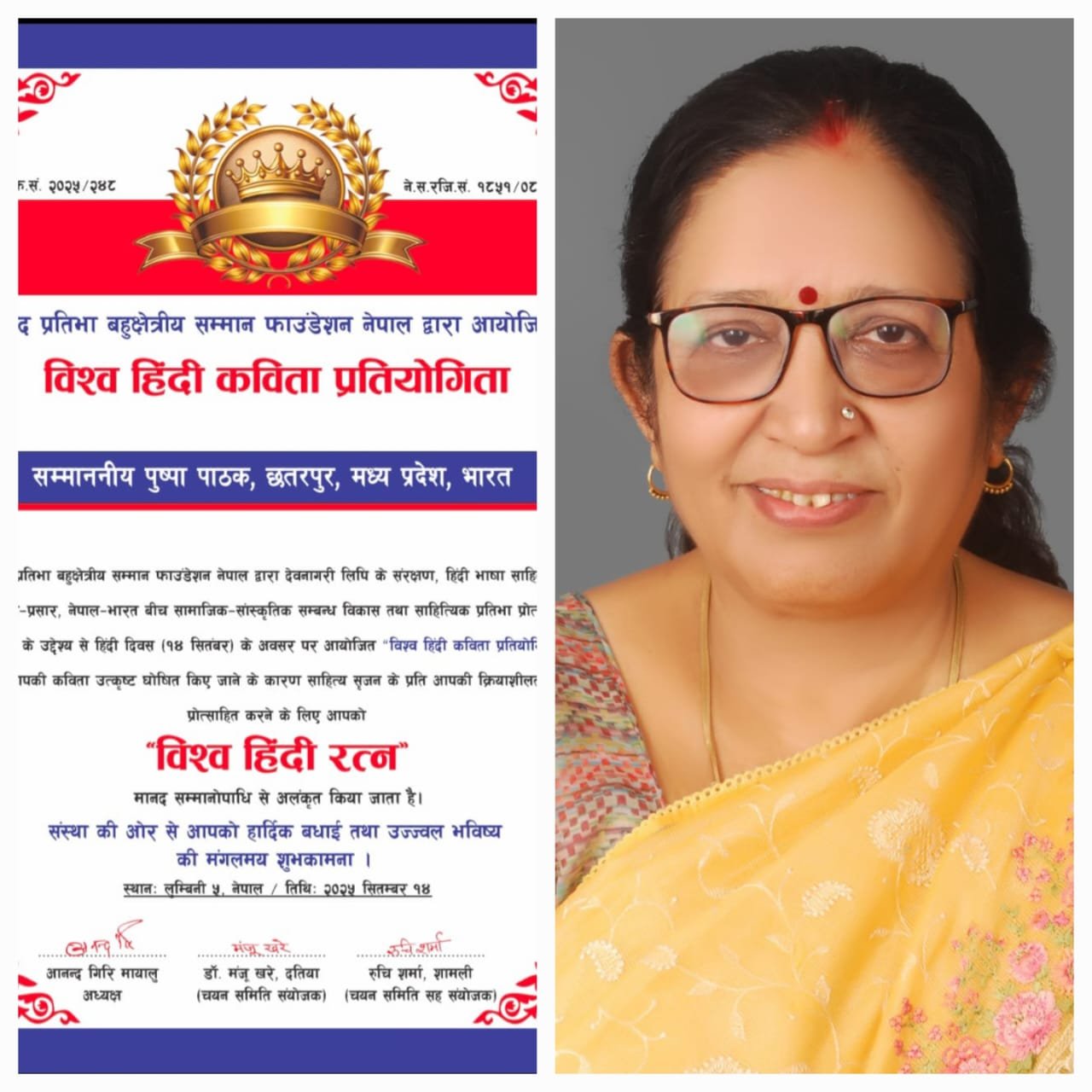 हिन्दी दिवस के अवसर पर एक अंतरराष्ट्रीय कविता प्रतियोगिता का लुंबिनी नेपाल में आयोजन किया गया। इस प्रतियोगिता में छतरपुर मध्य प्रदेश की श्रीमती पुष्पा पाठक को उनकी कविता की उत्कृष्टता के आधार पर विश्व हिन्दी रत्न मानद उपाधि से सम्मानित किया गया है ।