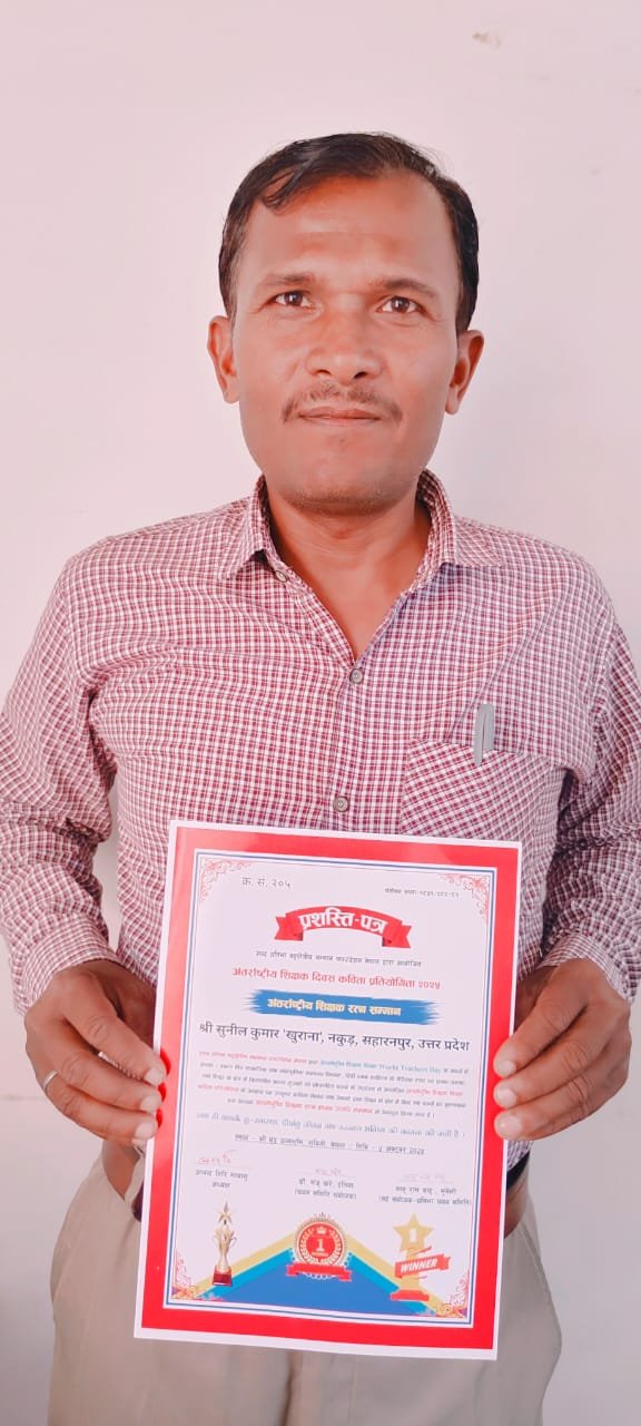 - लुंबिनी/नई दिल्ली, 5 अक्टूबर (ब्यूरो रिपोर्ट)। शिक्षण को एक सहयोगी पेशे के रूप में पुनर्निर्धारित करें मूल नारे के साथ आज विश्व भर में अंतर्राष्ट्रीय शिक्षक दिवस विभिन्न कार्यक्रमों का आयोजन कर मनाया जा रहा है। इस अवसर पर शब्द प्रतिभा बहुक्षेत्रीय सम्मान फाउन्डेशन नेपाल द्वारा अंतर्राष्ट्रीय स्तर की अंतर्राष्ट्रीय शिक्षक दिवस कविता प्रतियोगिता का आयोजन कर हिंदी काव्य साहित्य में सृजन करने वाले 260 कवि/कवयित्रियों को सम्मानित किया गया है। नेपाल भारत मैत्री, सामाजिक तथा सांस्कृतिक पर्यटन विकास, हिंदी भाषा साहित्य के प्रचार प्रसार, शिक्षक तथा साहित्यकारों को प्रोत्साहित करने के उद्देश्य से आयोजित अंतर्राष्ट्रीय शिक्षक दिवस कविता प्रतियोगिता में उत्तर प्रदेश के सहारनपुर जिला निवासी सुनील कुमार “खुराना” को प्रथम स्थान प्राप्त हुआ है। ज्ञात हो कि सुनील कुमार “खुराना” सहारनपुर जिले के ख्याति प्राप्त साहित्यकार तथा कवि हैं। इनकी सैकड़ों रचनाएं देश विदेश की विभिन्न पत्र पत्रिकाओं में प्रकाशित हुई है तथा दर्जनों प्रतिष्ठित सम्मान भी मिल चुके हैं। बहु प्रतीक्षित इस कविता प्रतियोगिता में 2143 महिला/पुरुष रचनाकारों ने अपनी कविता भेजकर सहभागिता व्यक्त की थी। उत्कृष्टता के आधार पर 214 शिक्षक/शिक्षिका रचनाकारों को अंतर्राष्ट्रीय शिक्षक रत्न मानद उपाधि सम्मान 2025, तथा 46 रचनाकारों को अंतर्राष्ट्रीय शिक्षा मित्र सम्मान से प्रशस्ति पत्र सर्टिफिकेट प्रदान कर सम्मानित किया गया है। प्रतियोगिता में प्रथम स्थान प्राप्त सुनील कुमार “खुराना” को प्रशस्ति पत्र, मोमेंटो, नेपाली टोपी, सबसे प्यारी मेरी हिंदी, तथा मेरी प्यारी मां साझा काव्य संग्रह प्रदान कर सम्मानित किया गया है। प्रथम स्थान प्राप्त कवि सुनील कुमार “खुराना” को अंतर्राष्ट्रीय शिक्षक रत्न मानद उपाधि सम्मान से सम्मानित किया गया हैं । सुनील कुमार “खुराना” को सम्मान प्रदान करते हुए संस्था के अध्यक्ष आनन्द गिरि मायालु ने कहा – शिक्षक सुनील कुमार खुराना” उच्च प्राथमिक विद्यालय बाधी नकुड़ सहारनपुर उत्तर प्रदेश में सहायक अध्यापक के पद कार्यरत हैं। सुनील कुमार “खुराना” के एक नायाब हीरा है, हीरे को जौहरी ही परख पाते हैं। सुनील कुमार “खुराना” बहुमुखी प्रतिभा के धनी व्यक्तित्व है। इनके 150 साझा संकलन प्रकाशित हो चुके हैं। सुनील कुमार “खुराना” की रचनाओं में समाज जागरण की अद्भुत शक्ति पाई गई है। आज संस्था ऐसी प्रतिभा को सम्मानित कर गौरव महसूस कर रही है। उत्तर प्रदेश राज्य को ऐसी प्रतिभाओं का सम्मान करना चाहिए। सुनील कुमार “खुराना” जैसे साहित्य साधक देश की अमूल्य निधि हैं।