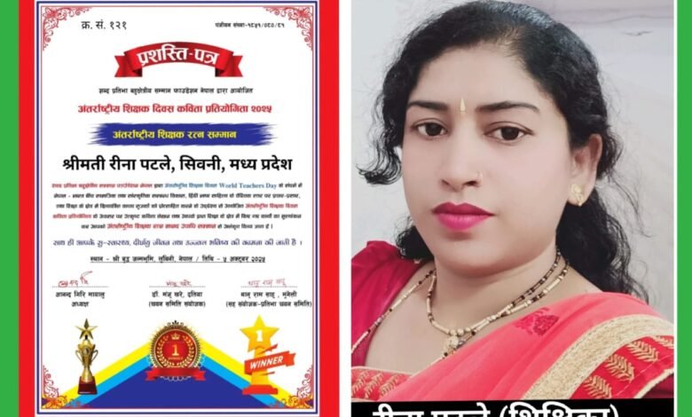 अंतर्राष्ट्रीय शिक्षक दिवस पर शिक्षिका रीना पटले को मिला अंतर्राष्ट्रीय शिक्षक रत्न सम्मान
