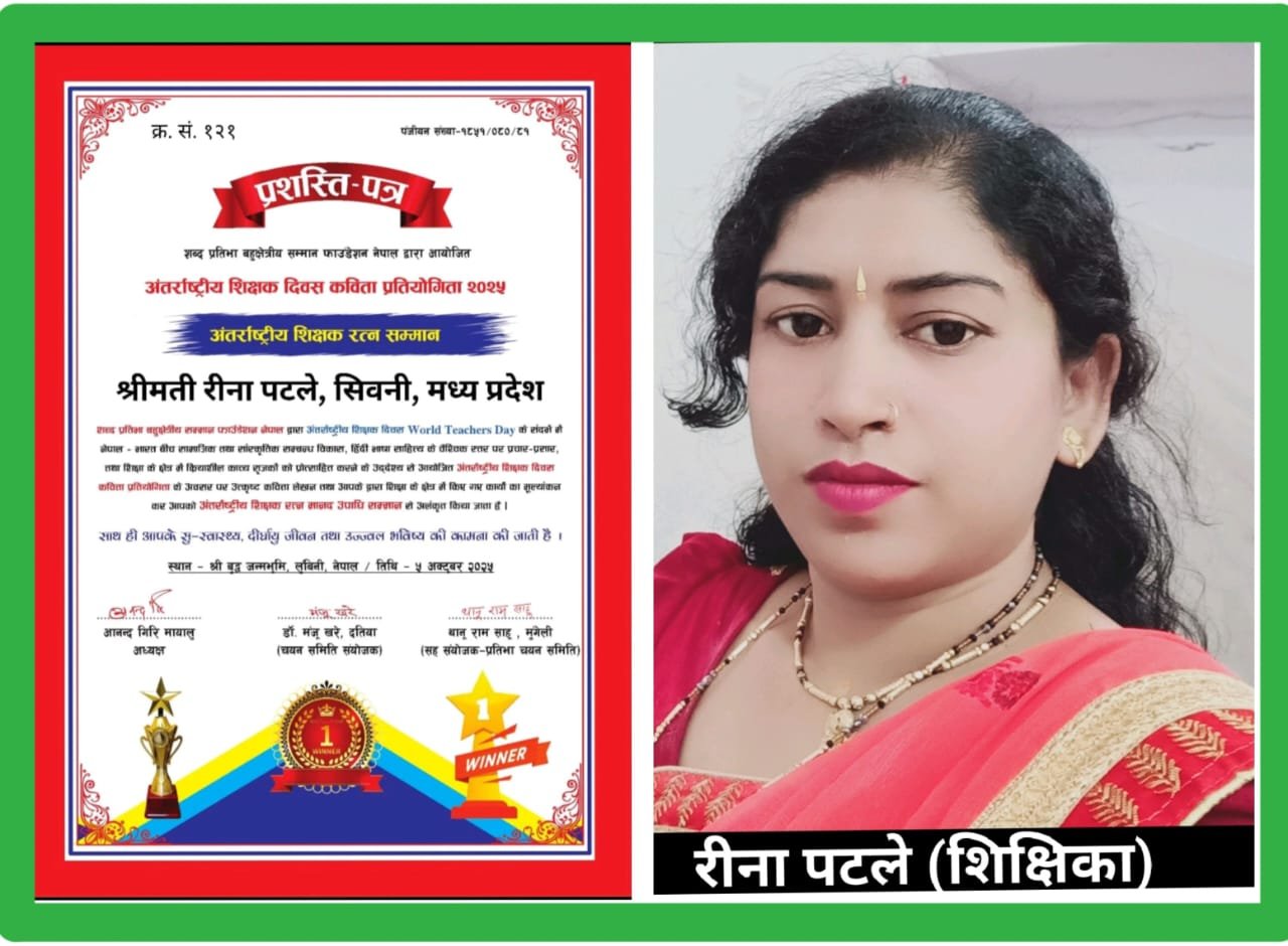 शिक्षण को एक सहयोगी पेशे के रूप में पुनर्निर्धारित करें मूल नारे के साथ आज विश्व भर में अंतर्राष्ट्रीय शिक्षक दिवस विभिन्न कार्यक्रमों का आयोजन कर मनाया गया। नेपाल की प्रसिद्ध संस्था शब्द प्रतिभा बहुक्षेत्रीय सम्मान फाउन्डेशन नेपाल द्वारा इस अवसर पर अंतर्राष्ट्रीय शिक्षक दिवस कविता प्रतियोगिता का आयोजन किया गया। इस अवसर पर सिवनी जिले की ख्याति प्राप्त कवयित्री/साहित्यकार तथा शिक्षिका रीना पटले जी को साहित्य सृजन तथा शिक्षा के क्षेत्र में उल्लेखनीय योगदान के लिए अंतर्राष्ट्रीय शिक्षक रत्न मानद उपाधि सम्मान से सम्मानित किया गया है। शिक्षिका रीना पटले की कई रचनाएं देश विदेश की विभिन्न पत्र पत्रिकाओं में प्रकाशित हुई है, साहित्य सृजन तथा शिक्षा विकास के लिए उत्कृष्ट कार्य हेतु दर्जनों प्रतिष्ठित सम्मान पुरस्कार भी मिल चुके हैं। आज आयोजित की गई इस अंतर्राष्ट्रीय शिक्षक दिवस कविता प्रतियोगिता में 2143 रचनाकारों की सहभागिता रही थी जिसमें उत्कृष्ट कविता के आधार पर 260 रचनाकारों को अंतर्राष्ट्रीय शिक्षक रत्न मानद उपाधि सम्मान तथा अंतर्राष्ट्रीय शिक्षा मित्र सम्मान एवं विश्व काव्य रत्न मानद उपाधि सम्मान से प्रशस्ति पत्र सर्टिफिकेट प्रदान कर सम्मानित किया गया है। कवयित्री रीना पटले मध्य प्रदेश राज्य के सिवनी जिला विकासखंड कुरई के विद्यालय शास. हाई स्कूल ऐरमा में शिक्षिका हैं। इन्हें सम्मानित करते हुए संस्था के संस्थापक अध्यक्ष आनन्द गिरि मायालु ने कहा – शब्द प्रतिभा द्वारा आयोजित आयोजनों में महिला प्रतिभाओं की सहभागिता पचास प्रतिशत रही है। रीना जी जैसी नारियां आज अपनी बहुमुखी प्रतिभा के बल पर देश विदेश में नाम रोशन कर रही है। संस्था बहुक्षेत्रीय प्रतिभाओं को निस्वार्थ भाव से प्रोत्साहित करती आई है। संस्था की ईमानदारिता और लगनशीलता से आज विश्व के एक दर्जन से अधिक देशों में रीना जी अपनी पहचान बनाने में सफल रही है।