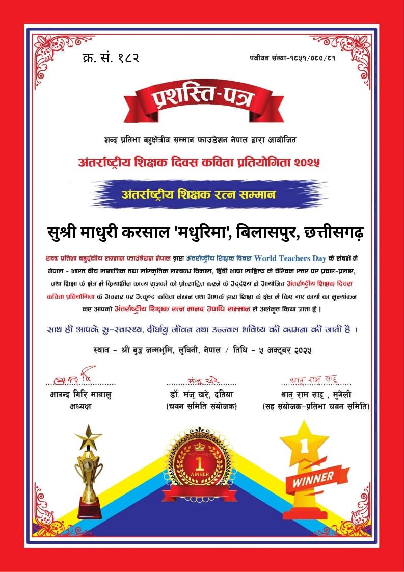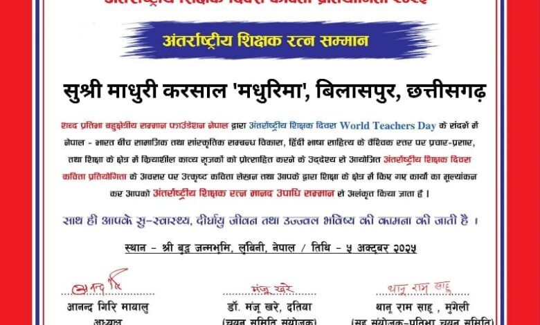 शिक्षण को एक सहयोगी पेशे के रूप में पुनर्निर्धारित करें मूल नारे के साथ आज विश्व भर में अंतर्राष्ट्रीय शिक्षक दिवस विभिन्न कार्यक्रमों का आयोजन कर मनाया गया। नेपाल की प्रसिद्ध संस्था शब्द प्रतिभा बहुक्षेत्रीय सम्मान फाउन्डेशन नेपाल द्वारा इस अवसर पर अंतर्राष्ट्रीय शिक्षक दिवस कविता प्रतियोगिता का आयोजन किया गया। इस अवसर पर राज्य छत्तीसगढ़ जिला रायगढ़ की ख्याति प्राप्त कवयित्री/साहित्यकार तथा शिक्षिका सुश्री माधुरी करसाल जी को साहित्य सृजन तथा शिक्षा के क्षेत्र में उल्लेखनीय योगदान के लिए अंतर्राष्ट्रीय शिक्षक रत्न मानद उपाधि सम्मान से सम्मानित किया गया है। शिक्षिका माधुरी करसाल की कई रचनाएं देश विदेश की विभिन्न पत्र पत्रिकाओं में प्रकाशित हुई है, साहित्य सृजन तथा शिक्षा विकास के लिए उत्कृष्ट कार्य हेतु दर्जनों प्रतिष्ठित सम्मान पुरस्कार भी मिल चुके हैं। आज आयोजित की गई इस अंतर्राष्ट्रीय शिक्षक दिवस कविता प्रतियोगिता में 2143 रचनाकारों की सहभागिता रही थी जिसमें उत्कृष्ट कविता के आधार पर 260 रचनाकारों को अंतर्राष्ट्रीय शिक्षक रत्न मानद उपाधि सम्मान तथा अंतर्राष्ट्रीय शिक्षा मित्र सम्मान एवं विश्व काव्य रत्न मानद उपाधि सम्मान से प्रशस्ति पत्र सर्टिफिकेट प्रदान कर सम्मानित किया गया है। कवयित्री माधुरी करसाल ,छत्तीसगढ़ राज्य के रायगढ़ जिला, विकास खंड तमनार के आ.जा.क.शासकीय प्राथमिक विद्यालय -छिंदभौना में प्रधानाध्यापिका के पद पर कार्यरत हैं। इन्हें सम्मानित करते हुए संस्था के संस्थापक अध्यक्ष आनन्द गिरि मायालु ने कहा – शब्द प्रतिभा द्वारा आयोजित आयोजनों में महिला प्रतिभाओं की सहभागिता पचास प्रतिशत रही है। माधुरी जी जैसी नारियां आज अपनी बहुमुखी प्रतिभा के बल पर देश विदेश में नाम रोशन कर रही है। संस्था बहुक्षेत्रीय प्रतिभाओं को निस्वार्थ भाव से प्रोत्साहित करती आई है। संस्था की ईमानदारिता और लगनशीलता से आज विश्व के एक दर्जन से अधिक देशों में माधुरी जी अपनी पहचान बनाने में सफल रही है।