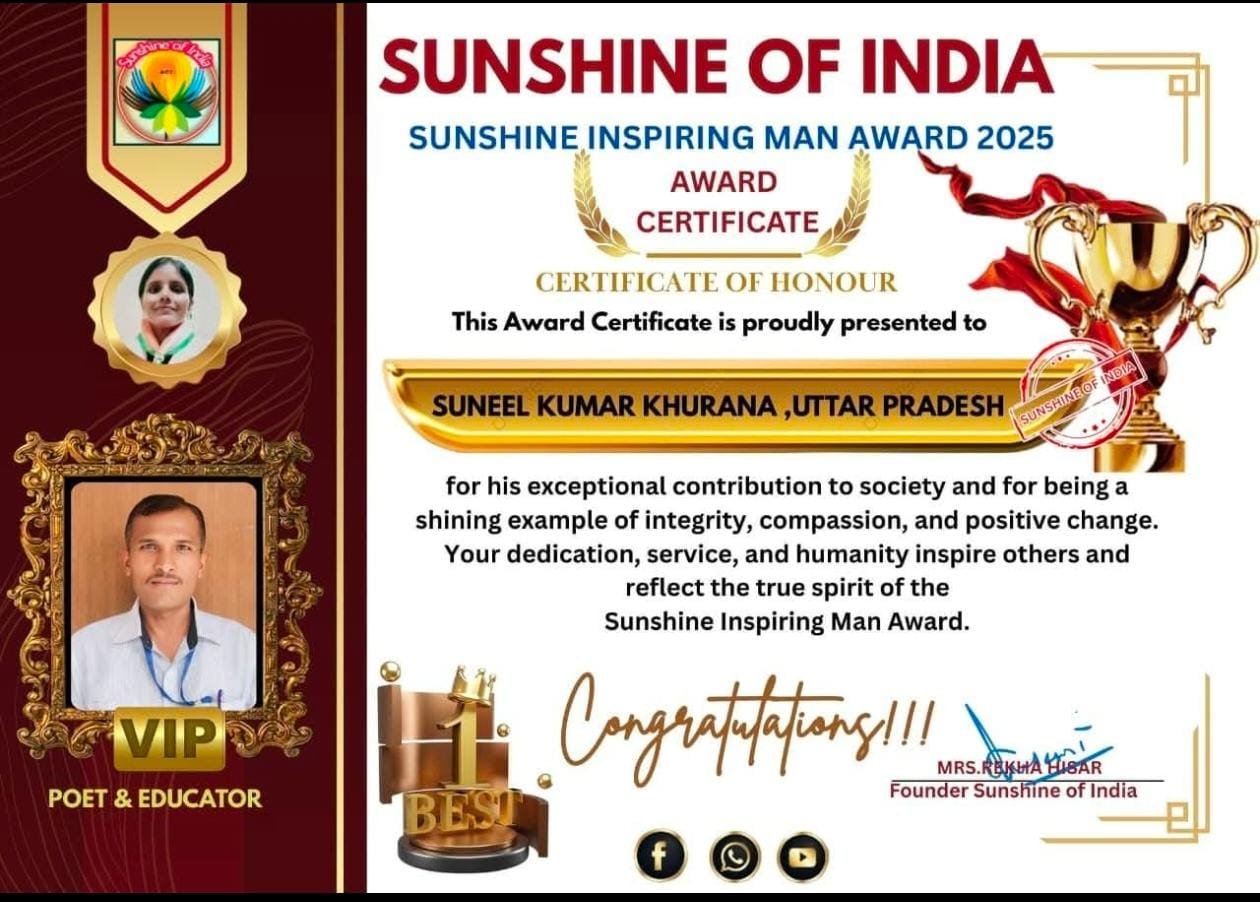 समाज के उत्थान,जनकल्याण, जागरूकता,शिक्षा,कला, संस्कृति,मानवता और शांति के लिए विशेष योगदान देने वाले प्रेरणादायी पुरुषों को सनशाइन ऑफ़ इंडिया द्वारा सनशाइन इंस्पायर अवार्ड मैन् 2025 से सम्मानित किया गया। सुनील कुमार “खुराना” सहारनपुर उत्तर प्रदेश लेखक के रूप में 10 वर्षों से कार्य कर रहे हैं। सुनील कुमार “खुराना” की कविताएं देश-विदेश में चर्चा का विषय बनी हुई है। सुनील कुमार “खुराना” उच्च प्राथमिक विद्यालय बाधी नकुड़ सहारनपुर उत्तर प्रदेश में प्रधानाध्यापक के पद पर कार्यरत हैं। सुनील कुमार “खुराना” विद्यालय में भी समय-समय पर नवाचार करते रहते हैं। सुनील कुमार “खुराना” की कविताएं गूगल पर ग्यारह लाख लोग सर्च कर चुके हैं। आप सुनील कुमार खुराना की 165 कविताएं गूगल पर पढ़ सकते हैं। सुनील कुमार “खुराना” को देश-विदेश में सैंकड़ों बार सम्मान से सम्मानित किया जा चुका है। सुनील कुमार “खुराना” नेपाल देश से भी कई बार सम्मानित किया जा चुके हैं। सुनील कुमार खुराना ने गूढ़ रहस्यों पर अपनी अनेक कविताएं लिख चुके हैं। सुनील कुमार “खुराना” की कविताएं समाज में बदलाव की ओर संकेत कर रही है।