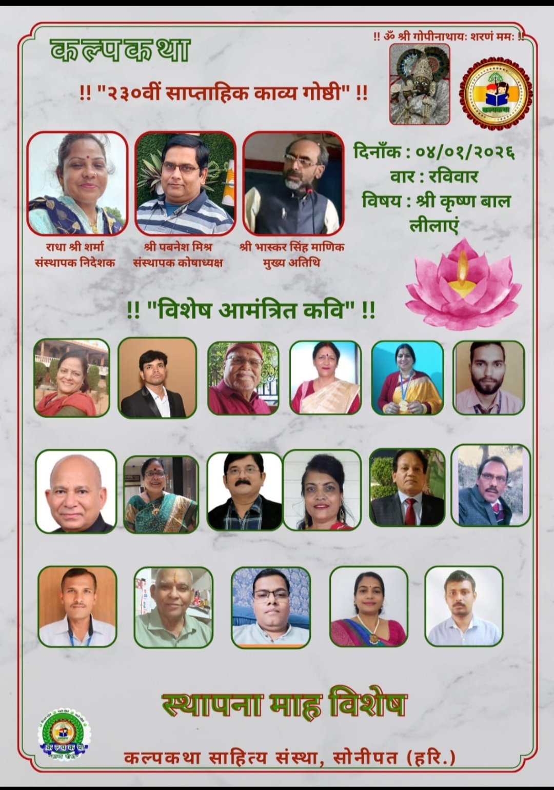 प्रभु श्री राधा गोपीनाथ जी महाराज की कृपा से संचालित राष्ट्र प्रथम, हिन्दी भाषा, सनातन संस्कृति, एवं सद साहित्य हेतु कृत संकल्पित कल्पकथा साहित्य संस्था परिवार की संवाद प्रभारी श्रीमती ज्योति राघव सिंह ने बताया कि कल्पकथा परिवार की २३०वीं साप्ताहिक ऑनलाइन काव्यगोष्ठी भगवान श्री कृष्ण की बाल लीलाओं को समर्पित रही।