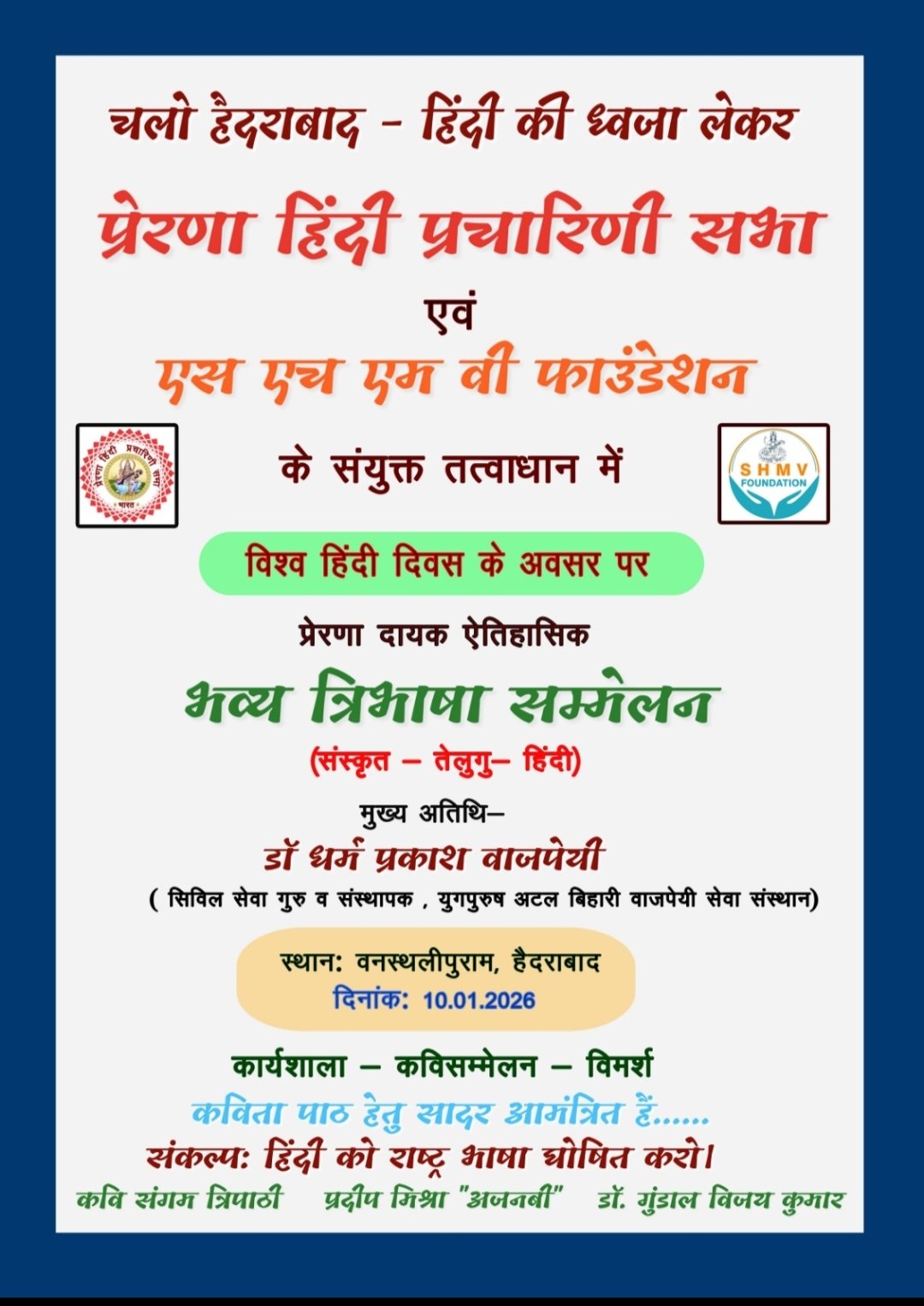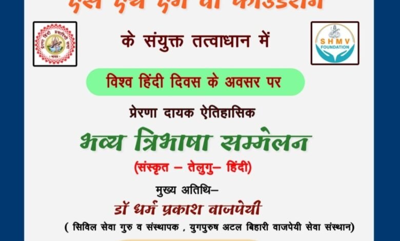 जबलपुर - प्रेरणा हिंदी प्रचारिणी सभा व एस एच एम वी फाउंडेशन हैदराबाद के संयुक्त तत्वावधान में विश्व हिंदी दिवस 10 जनवरी 26 को हैदराबाद में त्रिभाषा सम्मेलन व सम्मान समारोह आयोजित किया गया है।