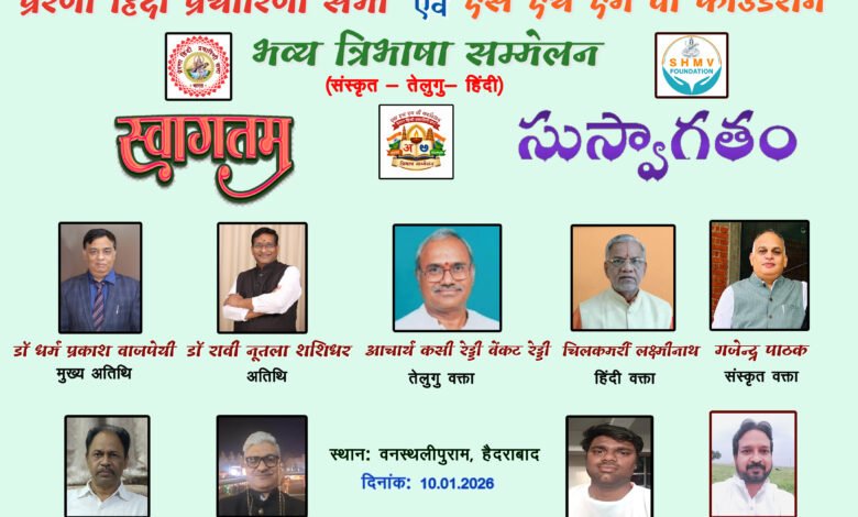 जबलपुर - प्रेरणा हिंदी प्रचारिणी सभा व एस एच एम वी फाउंडेशन हैदराबाद के संयुक्त तत्वावधान में विश्व हिंदी दिवस 10 जनवरी 26 को हैदराबाद में त्रिभाषा सम्मेलन व सम्मान समारोह आयोजित किया गया है।