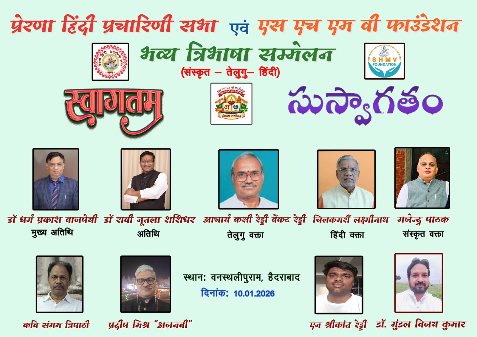 एस एच एम वी फाउंडेशन हैदराबाद के संस्थापक डॉ विजय कुमार के अनुसार त्रिभाषा सम्मेलन में मुख्य अतिथि डॉ धर्म प्रकाश वाजपेई दिल्ली व अतिथि डॉ रावी नूतला शशिधर जी आमंत्रित हैं।