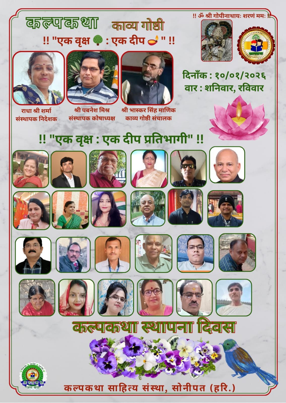 इस विशेष अवसर पर शनिवार १० जनवरी २०२६ को संस्था से जुड़े साहित्यकारों, रचनाकारों, सामाजिक कार्यकर्ताओं एवं संवेदनशील नागरिकों ने अपने-अपने निवास स्थानों पर प्रातः काल वृक्षारोपण कर प्रकृति के प्रति अपनी जिम्मेदारी का निर्वहन किया तथा सायंकाल भारतीय सेना, सैनिकों एवं परम बलिदानी योद्धाओं के सम्मान में दीप प्रज्ज्वलन कर राष्ट्र के प्रति अपनी भावनात्मक निष्ठा व्यक्त की।