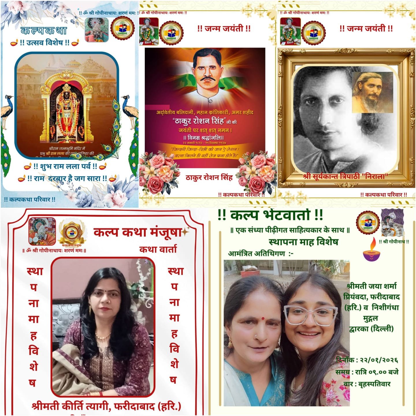 जबकि गुरुवार २२ जनवरी २०२६ को आयोजित राम मंदिर अवधधाम में प्राण प्रतिष्ठा वर्षगांठ एवं क्रांतिकारी बलिदानी स्वतंत्रता सेनानी ठाकुर रोशन सिंह जयंती विशेष यूट्यूब चैनल पर सीधे प्रसारण में दो पीढ़ियों के साथ साहित्यिक साक्षात्कार कार्यक्रम कल्प भेंटवार्ता में सूरदास सीही फरीदाबाद हरियाणा जुड़ी डॉ जया शर्मा प्रियंवदा के साथ उनकी दूसरी पीढ़ी से बहुमुखी प्रतिभा संपन्न कु. निशिगंधा मुद्गल के साथ रुचिकर संवाद किया गया।