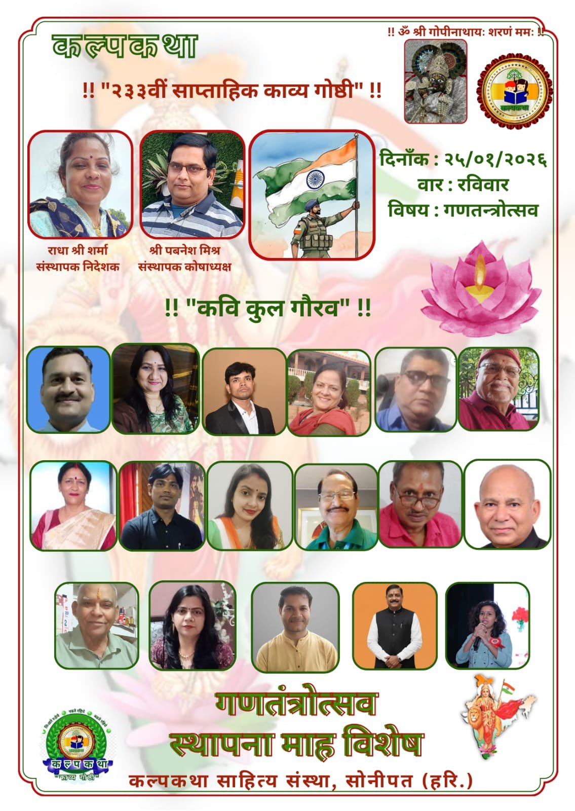 प्रभु श्री राधा गोपीनाथ जी महाराज की कृपा से संचालित राष्ट्र प्रथम, हिन्दी भाषा, सनातन संस्कृति, एवं सद साहित्य हेतु कृत संकल्पित कल्पकथा साहित्य संस्था परिवार की संवाद प्रभारी श्रीमती ज्योति राघव सिंह ने बताया कि गणतंत्र दिवस की पावन पूर्व संध्या पर कल्पकथा साहित्य संस्था परिवार के तत्वावधान में आयोजित 233वीं कल्पकथा साप्ताहिक ऑनलाइन काव्यगोष्ठी विषय “गणतंत्रोत्सव” अत्यंत गरिमामय, भावप्रवण एवं राष्ट्रप्रेम से ओतप्रोत वातावरण में सम्पन्न हुई। यह साहित्यिक आयोजन दो चरणों में तथा चार घंटों से अधिक समय तक सतत् राष्ट्रभावना की दिव्य प्रवाहधारा के साथ चलता रहा।