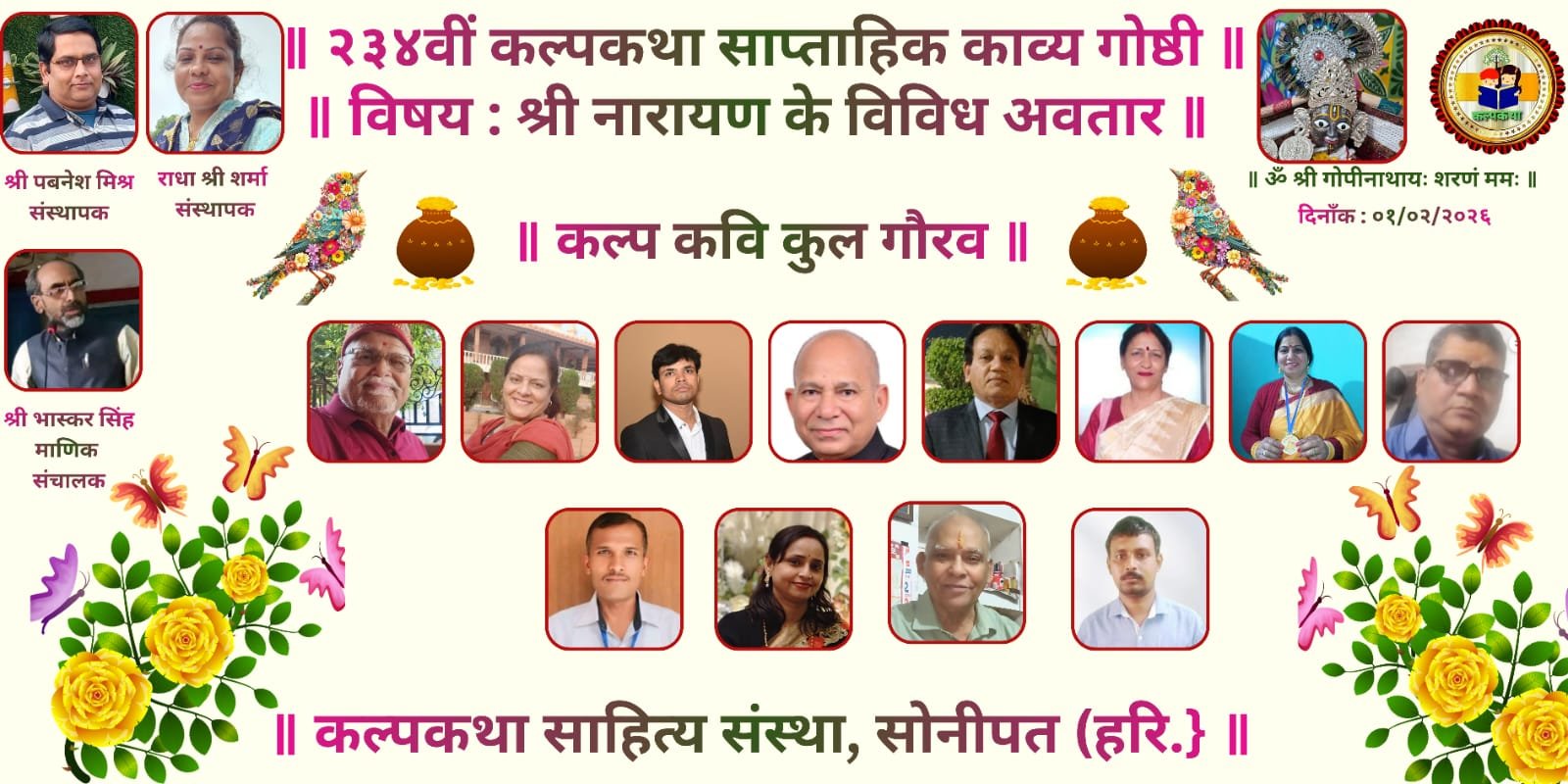 प्रभु श्री राधा गोपीनाथ जी महाराज की कृपा से संचालित राष्ट्र प्रथम हिन्दी भाषा सनातन संस्कृति एवं सद साहित्य हेतु कृत संकल्पित कल्पकथा साहित्य संस्था परिवार की संवाद प्रभारी ज्योति राघव सिंह ने बताया कि संस्था के तत्वावधान में आयोजित कल्पकथा साप्ताहिक काव्यगोष्ठी का क्रमांक–२३४ विषय “माघ पूर्णिमा एवं भगवान श्री हरि नारायण विष्णु के अवतार” पर अत्यंत श्रद्धामय, साहित्यिक एवं भावप्रवण वातावरण में सफलतापूर्वक सम्पन्न हुआ। यह आयोजन भक्ति, राष्ट्रभाव और साहित्यिक चेतना का अनुपम संगम सिद्ध हुआ।