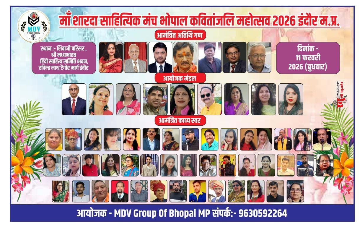 माँ शारदा साहित्यिक मंच जिला राजगढ़ (भोपाल) द्वारा 11 फरवरी 2026 दिन बुधवार को आयोजित होने जा रहा विराट कवि सम्मेलन। जिसका आयोजन शिवाजी परिसर श्री मध्य भारत हिंदी साहित्य समिति भवन रविन्द्र नाथ टैगोर मार्ग इंदौर में होगा ।
