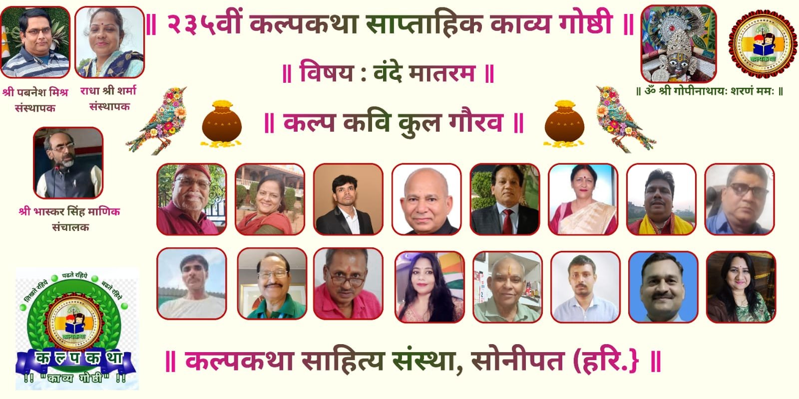 प्रभु श्री राधा गोपीनाथ जी महाराज की कृपा से संचालित राष्ट्रप्रथम, हिन्दीभाषा, सनातनसंस्कृति एवं सद साहित्य हेतु कृत संकल्पित कल्पकथा साहित्य संस्था परिवार के तत्त्वावधान में आयोजित २३५वीं साप्ताहिक ऑनलाइन काव्यगोष्ठी राष्ट्रगीत वंदे मातरम् को समर्पित एक भव्य, भावगर्भित एवं राष्ट्रप्रेम से ओतप्रोत साहित्यिक अनुष्ठान के रूप में सम्पन्न हुई।