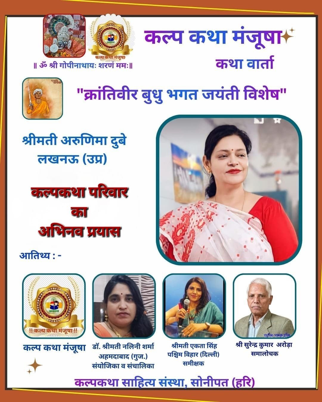 प्रभु श्री राधा गोपीनाथ जी महाराज की कृपा से संचालित कल्पकथा साहित्य संस्था परिवार की संवाद प्रभारी श्रीमती ज्योति राघव सिंह ने बताया कि कल्प कथा मंजूषा मंच लखनऊ उप्र कथाकार अरुणिमा दुबे की कहानियों से सजा।