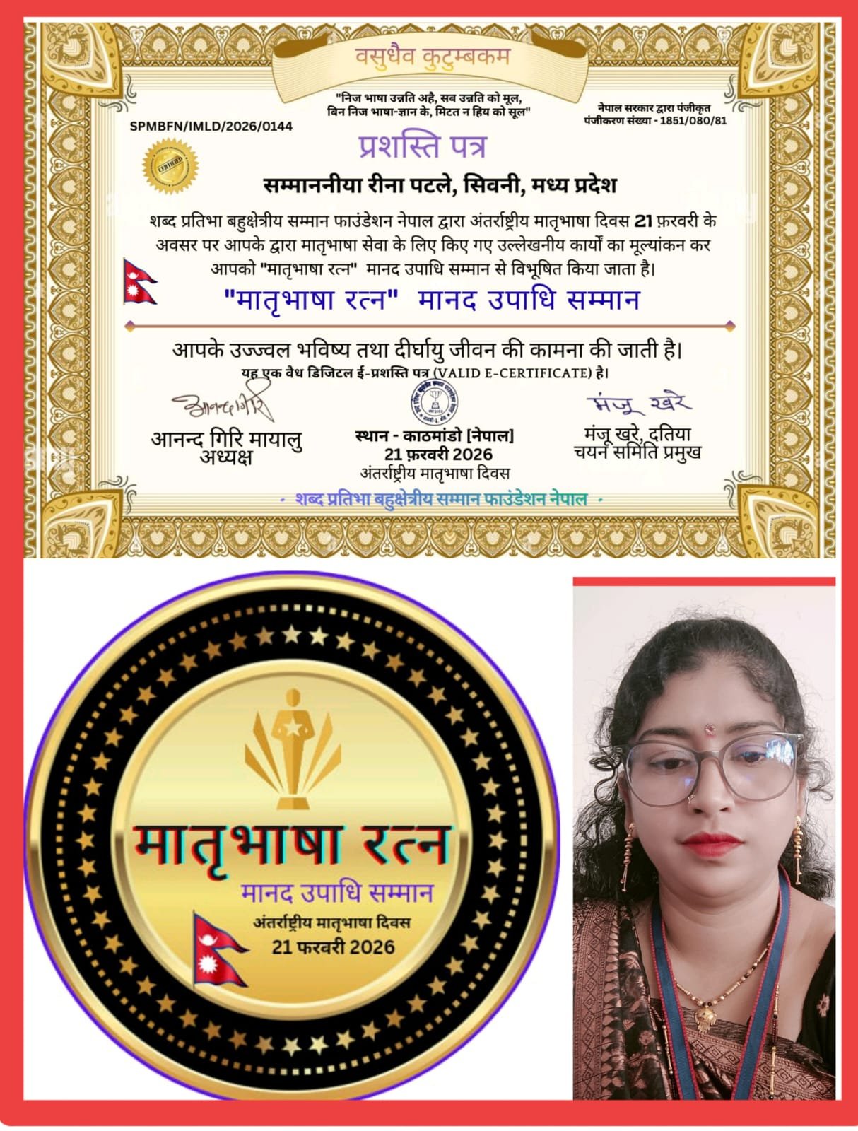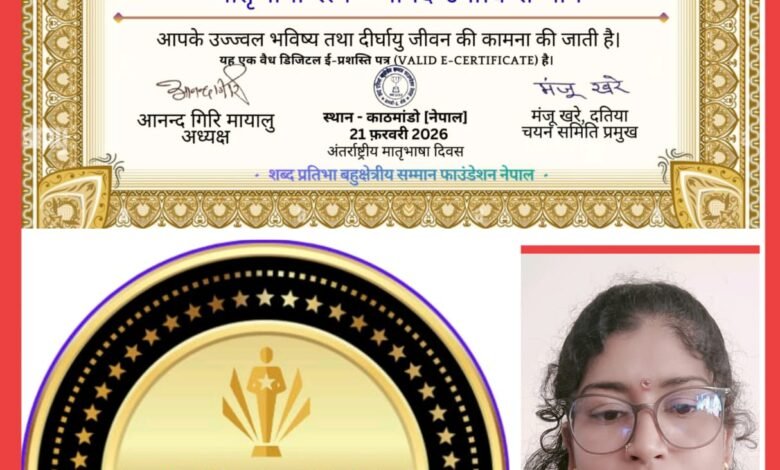 शिक्षिका/कवयित्री रीना पटले अंतर्राष्ट्रीय “मातृभाषा रत्न मानद उपाधि सम्मान” से हुई सम्मानित