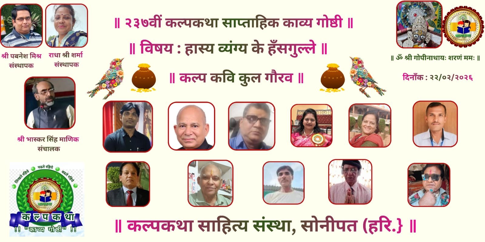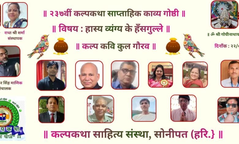 प्रभु श्री राधा गोपीनाथ जी महाराज की कृपा से संचालित राष्ट्र प्रथम, हिन्दी भाषा, सनातन संस्कृति, सद साहित्य, हेतु कृत संकल्पित कल्पकथा साहित्य संस्था परिवार द्वारा आयोजित २३७वीं साप्ताहिक ऑनलाइन काव्यगोष्ठी हास्य व्यंग्य के हंसगुल्ले सचमुच हँसी का गुलदस्ता सिद्ध हुई।