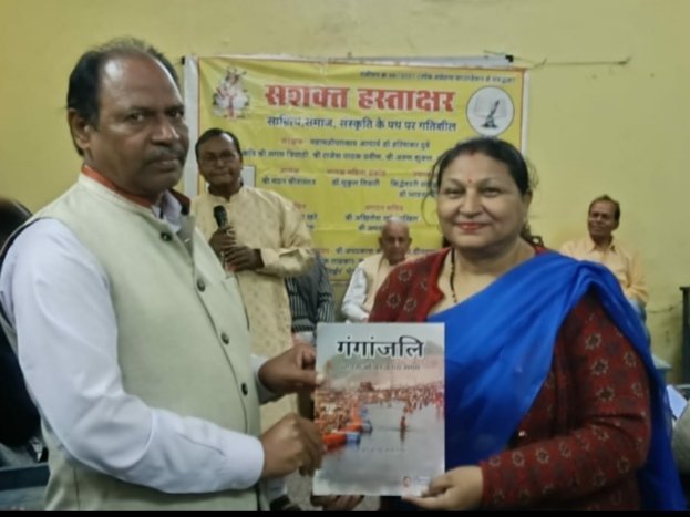 गंगांजलि साझा काव्य संग्रह संस्कारधानी जबलपुर की कवयित्री अर्चना गोस्वामी को कवि संगम त्रिपाठी ने भेंट की।