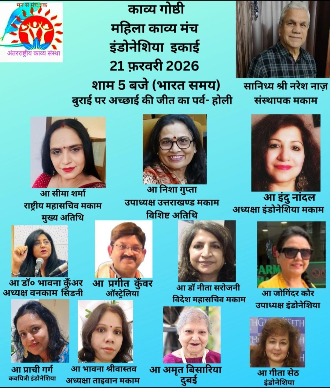 होली के पर्व पर उन्होंने इंडोनेशिया में महिला काव्य मंच की काव्य गोष्ठी का आयोजन किया ।आ नरेश नाज़ जी महिला काव्य मंच के संस्थापक हैं और इंदु नांदल महिला काव्य मंच की इंडोनेशिया की अध्यक्ष हैं ।