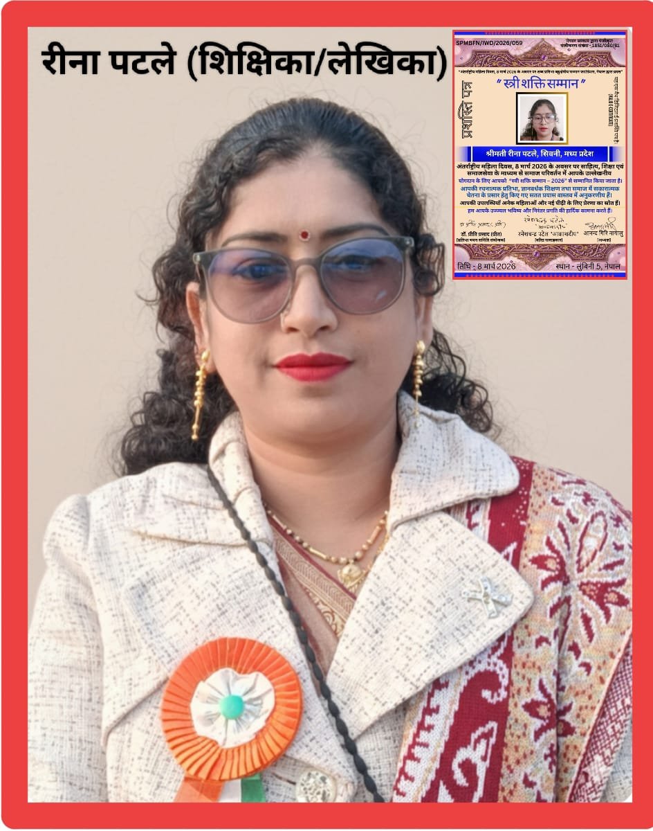 नेपाल भारत मैत्री विकास, मिथिला तथा अवध सांस्कृतिक पर्यटन विकास, देवनागरी लिपि के संरक्षण संवर्द्धन, हिंदी तथा नेपाली भाषा को मैत्री भाषा के रूप में प्रचार प्रसार करने तथा देश विदेश की विभिन्न क्षेत्र की महिला प्रतिभाओं को प्रोत्साहित करने के उद्देश्य से आज अंतर्राष्ट्रीय महिला दिवस के अवसर पर आयोजित एक कार्यक्रम में रीना जी को सम्मानित किया गया है। शब्द प्रतिभा बहुक्षेत्रीय सम्मान फाउन्डेशन नेपाल द्वारा आज रीना पटले के साथ नेपाल, भारत सहित विश्व के सात देश की सैकड़ों महिला कवयित्रियों, लेखिकाओं, समाज सेविकाओं और शिक्षिकाओं को ई प्रशस्ति पत्र सर्टिफिकेट प्रदान कर सम्मानित किया गया है। रीना पटले जिला सिवनी की एक प्रसिद्ध लेखिका, कवयित्री और शिक्षिका हैं, इनकी सैकड़ों रचनाएं विभिन्न पत्रिकाओं तथा संकलनों में प्रकाशित हो चुकी है। संस्था के अध्यक्ष आनन्द गिरि मायालु ने रीना पटले को सम्मानित करते हुए कहा – मध्यप्रदेश की धरती बहुमुखी प्रतिभाओं से भरी है, इसी धरती की होनहार प्रतिभा के रूप में आज रीना पटले जी को सम्मानित कर गर्व हो रहा है। ऐसी रचनात्मक क्षमता की धनी प्रतिभाओं को राज्य और केंद्र सरकार द्वारा आर्थिक सहयोग तथा सम्मान प्रदान कर प्रोत्साहन देने की आवश्यकता है।