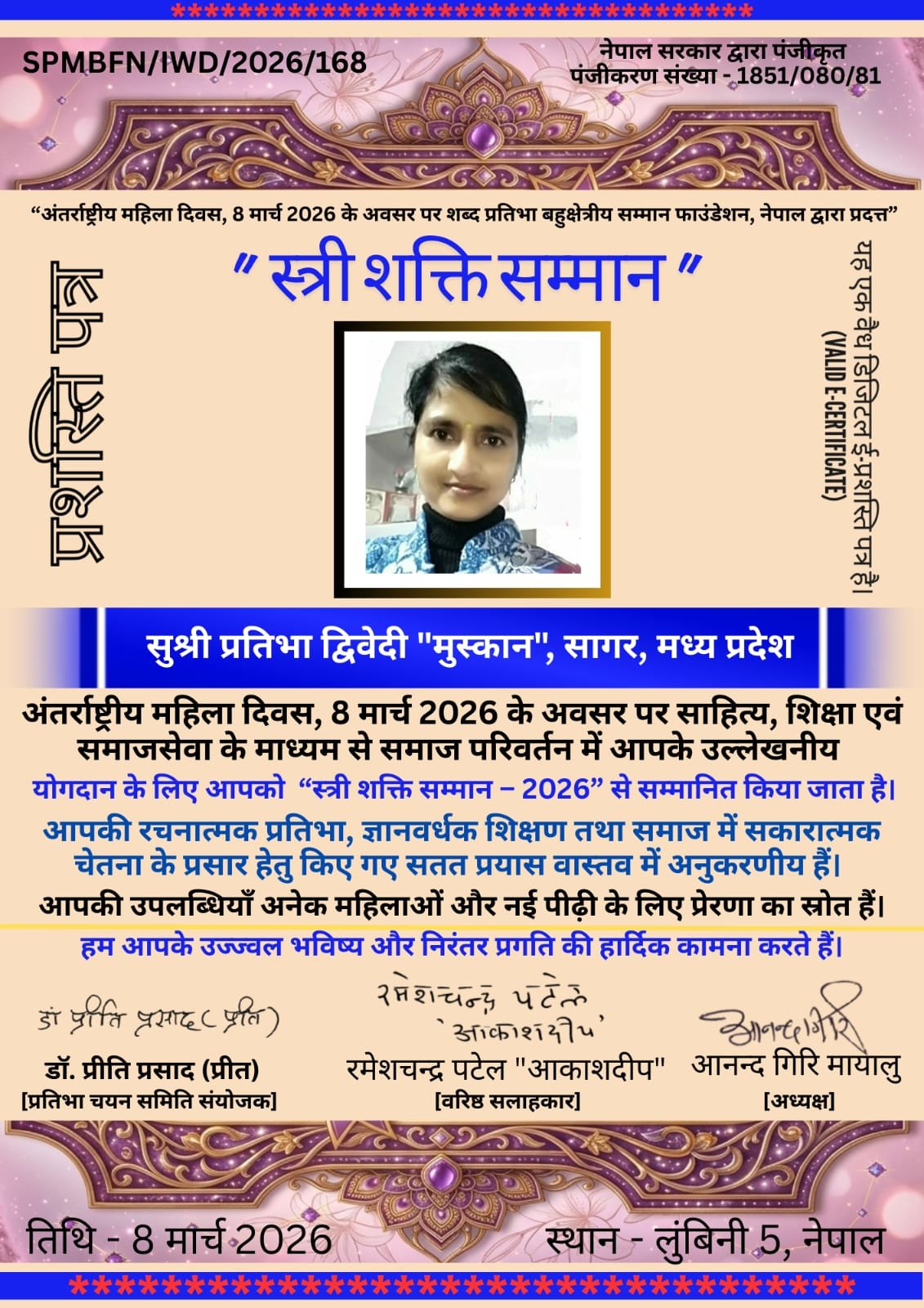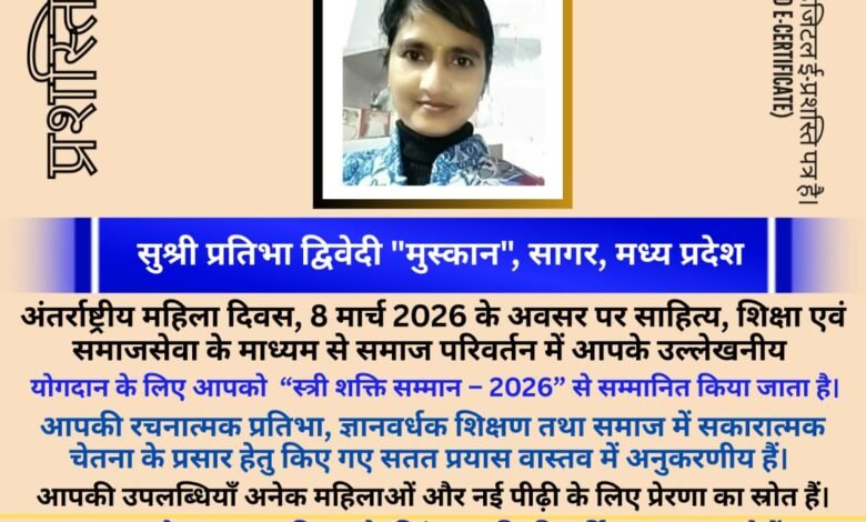 नेपाल भारत मैत्री विकास, बुंदेलखंड सांस्कृतिक पर्यटन विकास, देवनागरी लिपि के संरक्षण संवर्द्धन, हिंदी तथा नेपाली भाषा को मैत्री भाषा के रूप में प्रचार प्रसार करने तथा देश विदेश की विभिन्न क्षेत्र की महिला प्रतिभाओं को प्रोत्साहित करने के उद्देश्य से आज अंतर्राष्ट्रीय महिला दिवस के अवसर पर आयोजित एक कार्यक्रम में प्रतिभा द्विवेदी को सम्मानित किया गया है। शब्द प्रतिभा बहुक्षेत्रीय सम्मान फाउन्डेशन नेपाल द्वारा आज प्रतिभा द्विवेदी “मुस्कान” के साथ नेपाल, भारत सहित विश्व के सात देश की 300 महिला कवयित्रियों, लेखिकाओं, समाज सेविकाओं और शिक्षिकाओं को ई प्रशस्ति पत्र सर्टिफिकेट प्रदान कर सम्मानित किया गया है। प्रतिभा द्विवेदी “मुस्कान” जिले की एक उभरती हुई लेखिका,कवयित्री और भूतपूर्व सहायक बी.एड प्राध्यापिका हैं, इनकी सैकड़ों रचनाएं विभिन्न पत्रिकाओं तथा संकलनों में प्रकाशित हो चुकी है। संस्था के अध्यक्ष आनन्द गिरि मायालु ने प्रतिभा द्विवेदी “मुस्कान” को सम्मानित करते हुए कहा – मध्यप्रदेश की धरती बहुमुखी प्रतिभाओं से भरी है, इसी धरती की होनहार प्रतिभा के रूप में आज प्रतिभा द्विवेदी “मुस्कान” को सम्मानित कर गर्व हो रहा है। ऐसी रचनात्मक क्षमता की धनी प्रतिभाओं की राज्य और केंद्र सरकार द्वारा आर्थिक सहयोग तथा सम्मान प्रदान कर प्रोत्साहन देने की आवश्यकता है।
