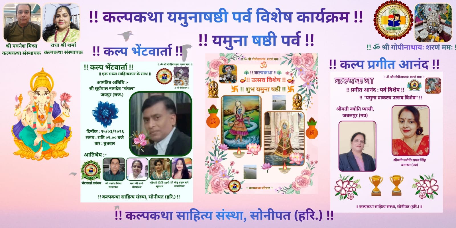 प्रभु श्री राधा गोपीनाथ जी महाराज की कृपा से संचालित राष्ट्र प्रथम, हिन्दी भाषा, सनातन संस्कृति, सद साहित्य हेतु कृत संकल्पित कल्पकथा साहित्य संस्था परिवार के संवाद प्रमुख भगवानदास शर्मा प्रशांत ने बताया कि संस्था परिवार द्वारा चैत्र नवरात्रि – यमुना षष्ठी पर्व पर भक्ति भाव पूर्ण कार्यक्रमों का गरिमामय आयोजन किया गया।