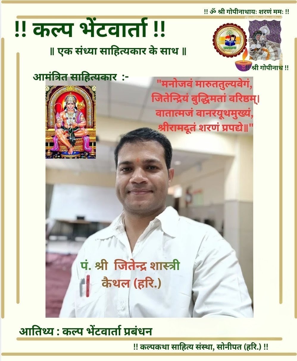 प्रभु श्री राधा गोपीनाथ जी महाराज की कृपा से संचालित कल्पकथा साहित्य संस्था परिवार की संवाद प्रभारी ज्योति राघव सिंह ने बताया कि श्रीमती कीर्ति त्यागी के संयोजन में कल्प भेंटवार्ता कार्यक्रम में कैथल हरियाणा से जुड़े प्रबुद्ध साहित्यकार पण्डित जीतेंद्र शास्त्री जी को कल्प भेंटवार्ता पत्रम से सम्मानित किया गया।