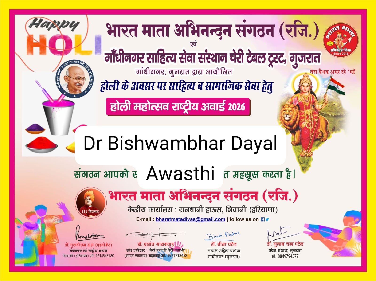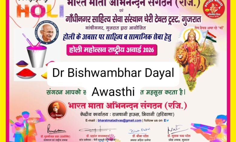 भारत माता अभिनन्दन संगठन एवं गांधीनगर साहित्य सेवा संगठन चेरी टेबल ट्रस्ट, गुजरात के संयुक्त तत्वावधान में होली महोत्सव कार्यक्रम का आयोजन किया गया। इस आयोजन में खुर्जा, बुलंदशहर ( उ. प्र.) के चर्चित,प्रख्यात कवि एवं आकाशवाणी दूरदर्शन के गीतकार डॉ. विश्वम्भर दयाल अवस्थी ‘ विद्या – सागर ‘ ने होली गीत की प्रस्तुति से सभागार में उपस्थित श्रोताओं को मन्त्रमुग्ध कर दिया। तालियों की गड़गड़ाहट से पूरा पांडाल गूँज उठा। संस्था के संस्थापक डॉ. पुरुषोत्तम दास एडवोकेट, ब्रांड एम्बेस्टर भारत सरकार, महाराष्ट्र डॉ. प्रशांत गायकबाड़ , अध्यक्ष महिला प्रकोष्ठ डॉ. बीना पटेल,पदेश अध्यक्ष गुजरात डॉ. गुलाब चंद पटेल द्वारा डॉ. विश्वम्भर दयाल अवस्थी ‘ विद्या – सागर ‘ को ” होली महोत्सव राष्ट्रीय अवार्ड – 2026” से सम्मानित किया गया।