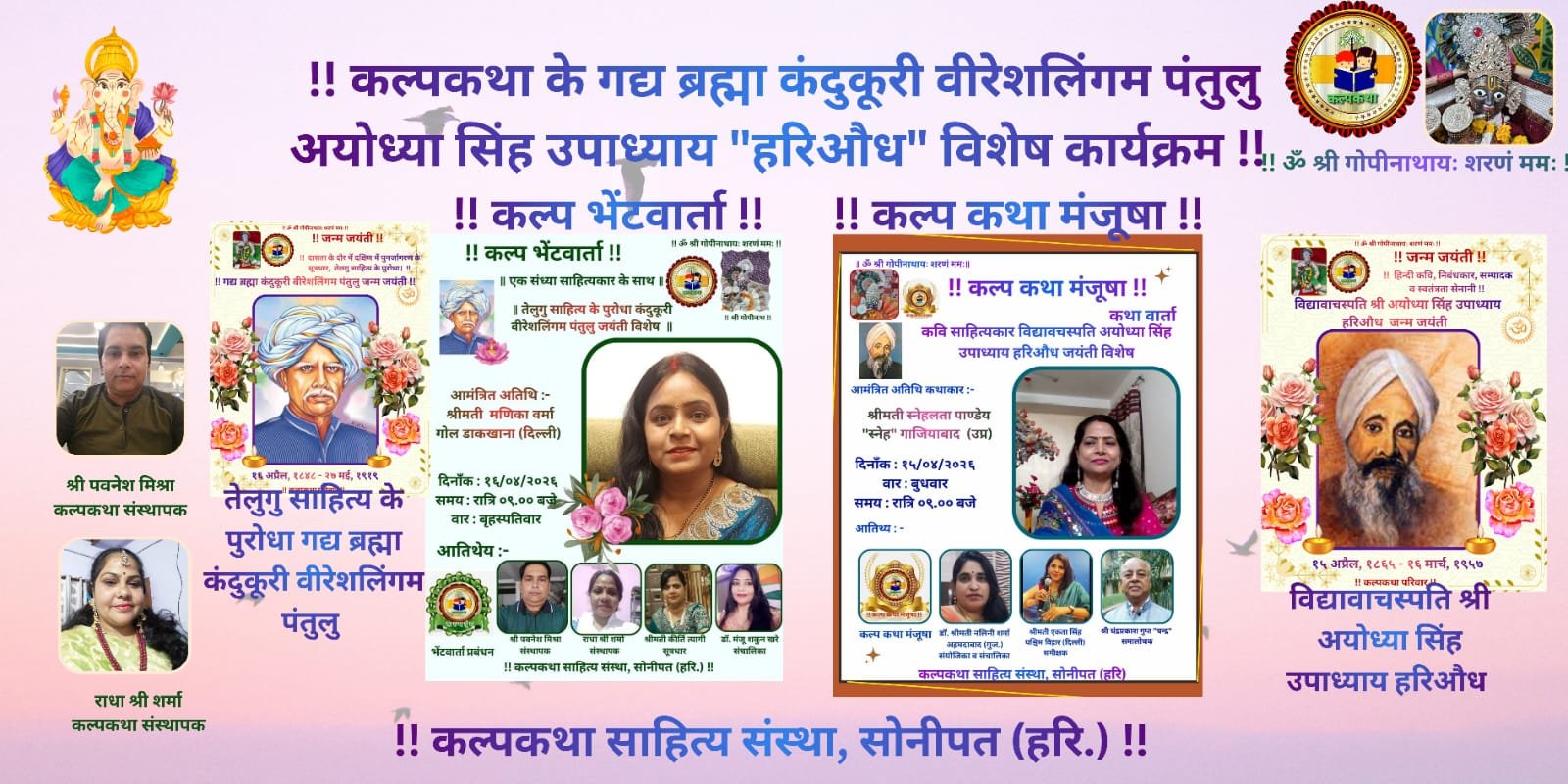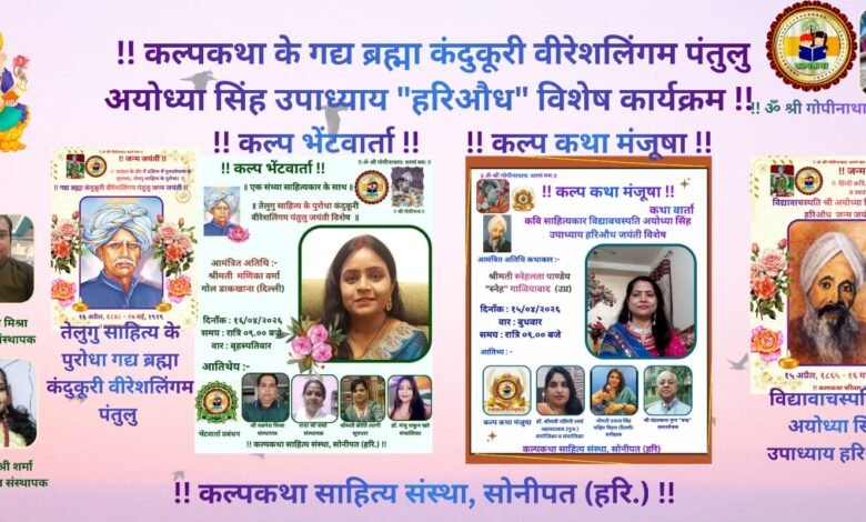 प्रभु श्री राधा गोपीनाथ जी महाराज की कृपा से संचालित राष्ट्र प्रथम, हिन्दी भाषा, सनातन संस्कृति, सद साहित्य हेतु कृत संकल्पित कल्पकथा साहित्य संस्था परिवार की संवाद प्रभारी ज्योति राघव सिंह ने बताया कि संस्था परिवार द्वारा यूट्यूब चैनल पर सीधे प्रसारण में साहित्य वाचस्पति अयोध्या सिंह उपाध्याय हरिऔध जयंती पर कल्प कथा मंजूषा, एवं गद्य ब्रह्मा कंदुकूरी वीरेशलिंगम पंतुलु जयंती पर कल्प भेंटवार्ता का गरिमामय कार्यक्रमों का आयोजन किया गया।
