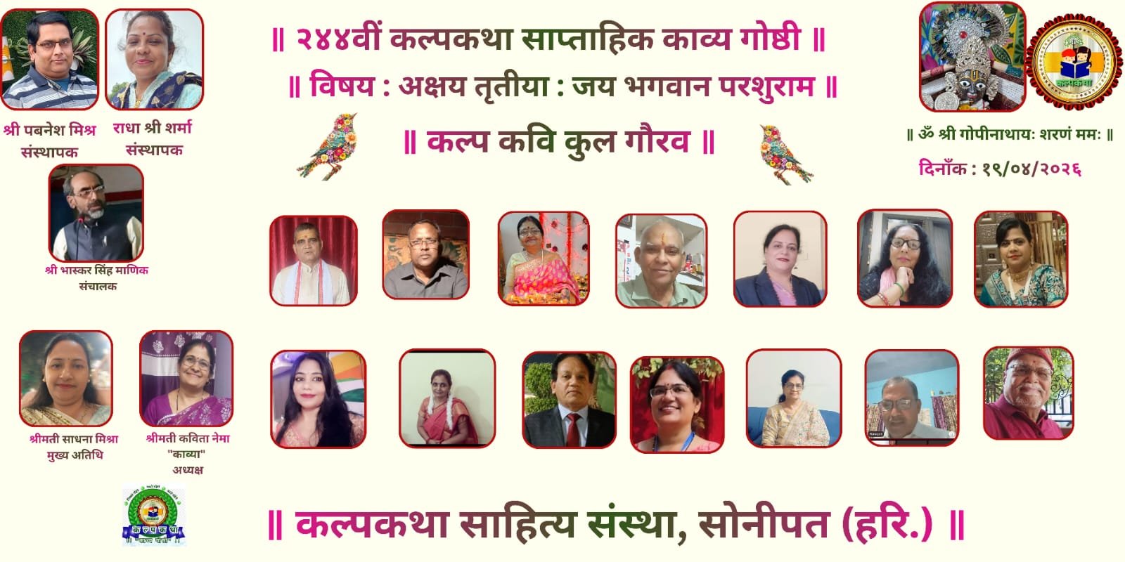 प्रभु श्री राधा गोपीनाथ जी महाराज की कृपा से संचालित, राष्ट्र प्रथम, हिन्दी भाषा, सनातन संस्कृति, एवं सद साहित्य हेतु कृत संकल्पित कल्पकथा साहित्य संस्था परिवार, सोनीपत (हरियाणा) की संवाद प्रभारी ज्योति राघव सिंह ने बताया कि संस्था के तत्वावधान में २४५वीं साप्ताहिक काव्यगोष्ठी का भव्य एवं गरिमामय आयोजन “जय भगवान परशुराम” विषय पर संपन्न हुआ।