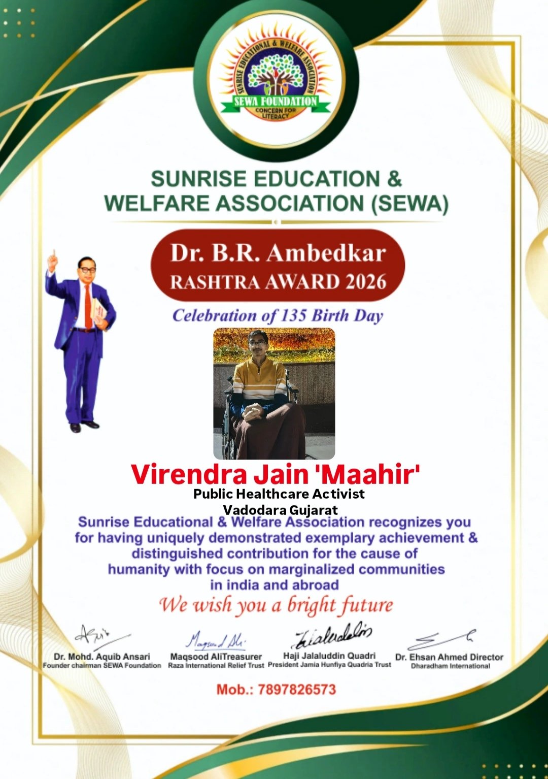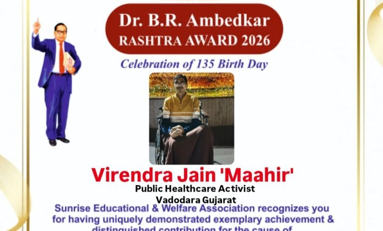 सनराइज एजुकेशन एंड वेलफेयर एसोसिएशन (SEWA) द्वारा भारत के महान विधिवेत्ता, समाज सुधारक एवं संविधान निर्माता डॉ. भीमराव रामजी आंबेडकर की 135वीं जयंती के पावन अवसर पर एक गरिमामय एवं विचारोत्तेजक समारोह का आयोजन किया गया। इस अवसर पर समाज सेवा एवं जनस्वास्थ्य के क्षेत्र में विशिष्ट योगदान के लिए “डॉ. बी.आर. आंबेडकर राष्ट्र अवॉर्ड 2026” से वडोदरा, गुजरात के सुप्रसिद्ध पब्लिक हेल्थकेयर एक्टिविस्ट विरेन्द्र जैन ‘माहिर’ को सम्मानित किया गया।