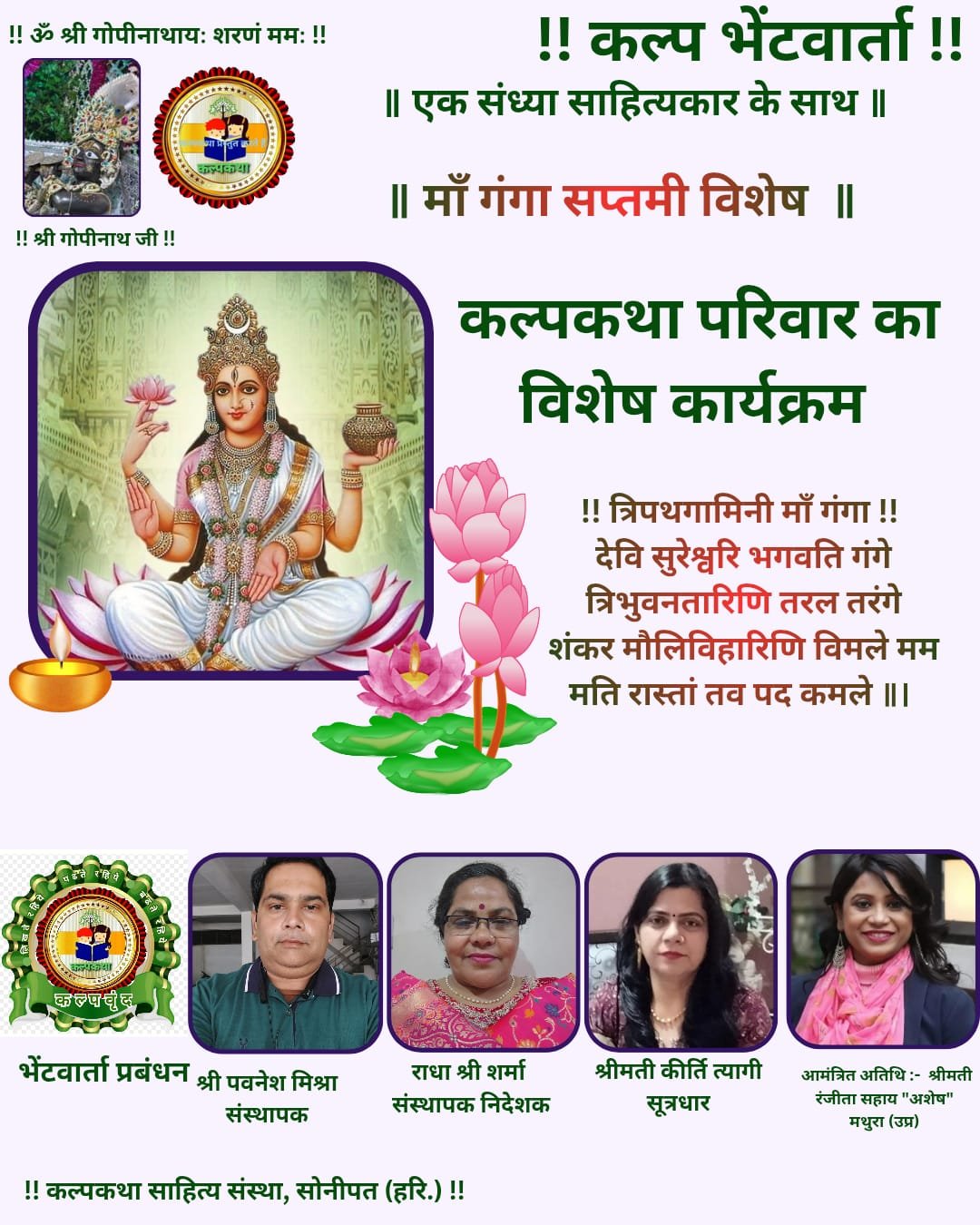 प्रभु श्री राधा गोपीनाथ जी महाराज की कृपा से संचालित कल्पकथा साहित्य संस्था परिवार की संवाद प्रभारी ज्योति राघव सिंह ने बताया कि श्रीमती कीर्ति त्यागी के संयोजन में पुण्य सलिला माँ गंगा के जाह्नवी अवतरण पर्व गंगा सप्तमी पर मथुरा से जुड़ीं युवा साहित्यकार श्रीमती रंजीता सहाय अशेष जी को कल्प भेंटवार्ता पत्रम से सम्मानित किया गया।