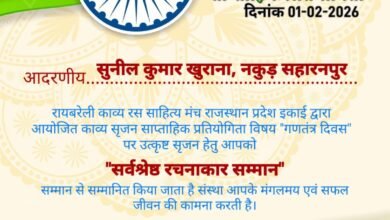 सुनील कुमार खुराना सहारनपुर उत्तर प्रदेश को मिला सर्वश्रेष्ठ रचनाकार सम्मान 2026 मिला